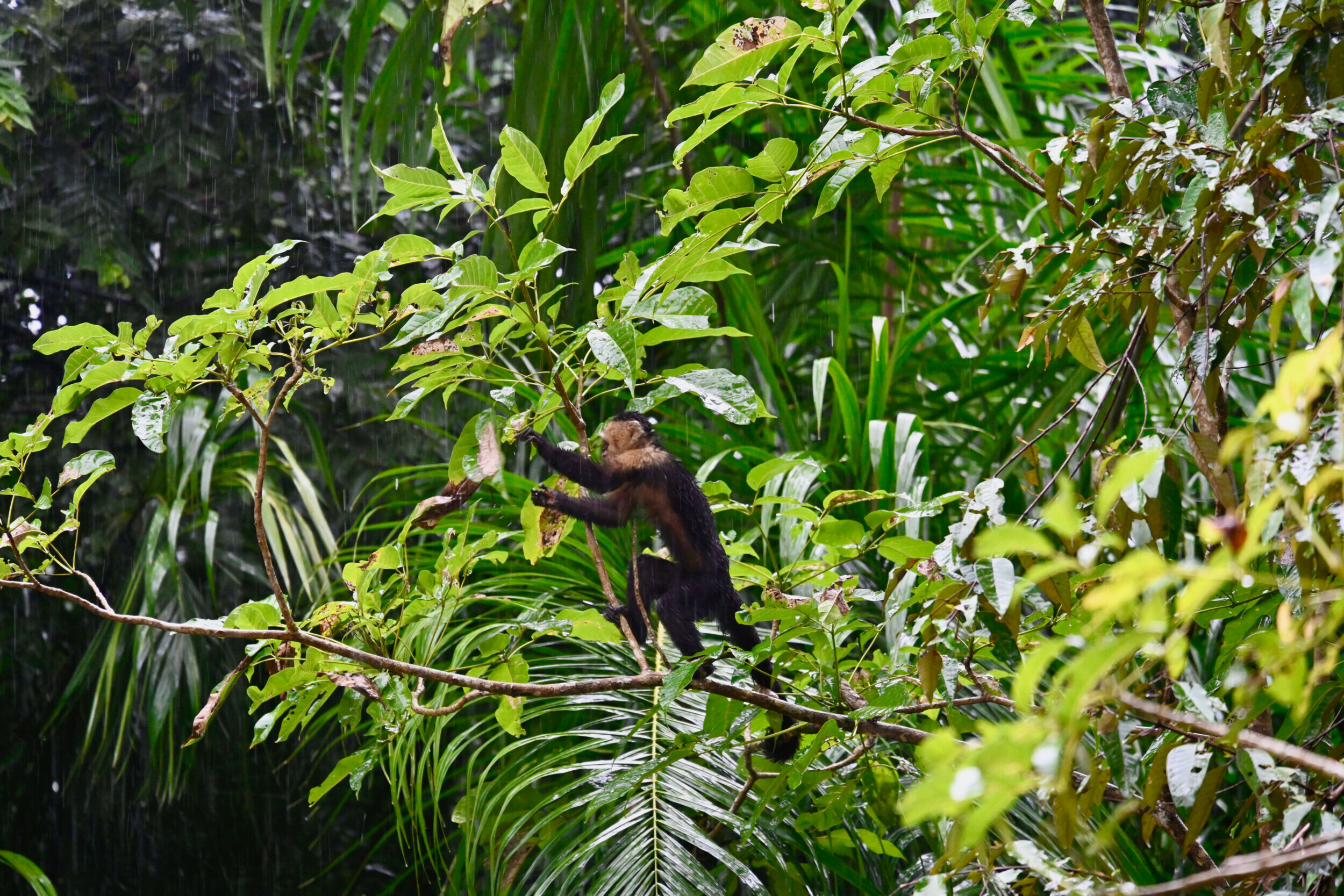 As we ventured further, the captain's unexpected calls into the wilderness piqued our curiosity. The anticipation built until, with a pointed finger and a few words in Spanish, our attention was drawn to the bushes. The promise of encountering monkeys, against the odds of the rain, held us in suspense, a testament to the unpredictability and wonder of exploring Costa Rica's natural world.